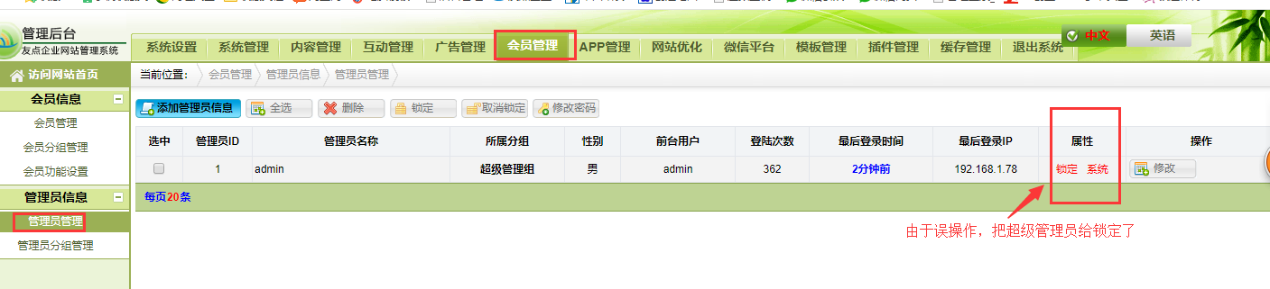 這里經常會有用戶無意間操作點擊把后臺超級管理員給鎖定了,導致無法進入后臺,這種情況應該怎么處理呢?