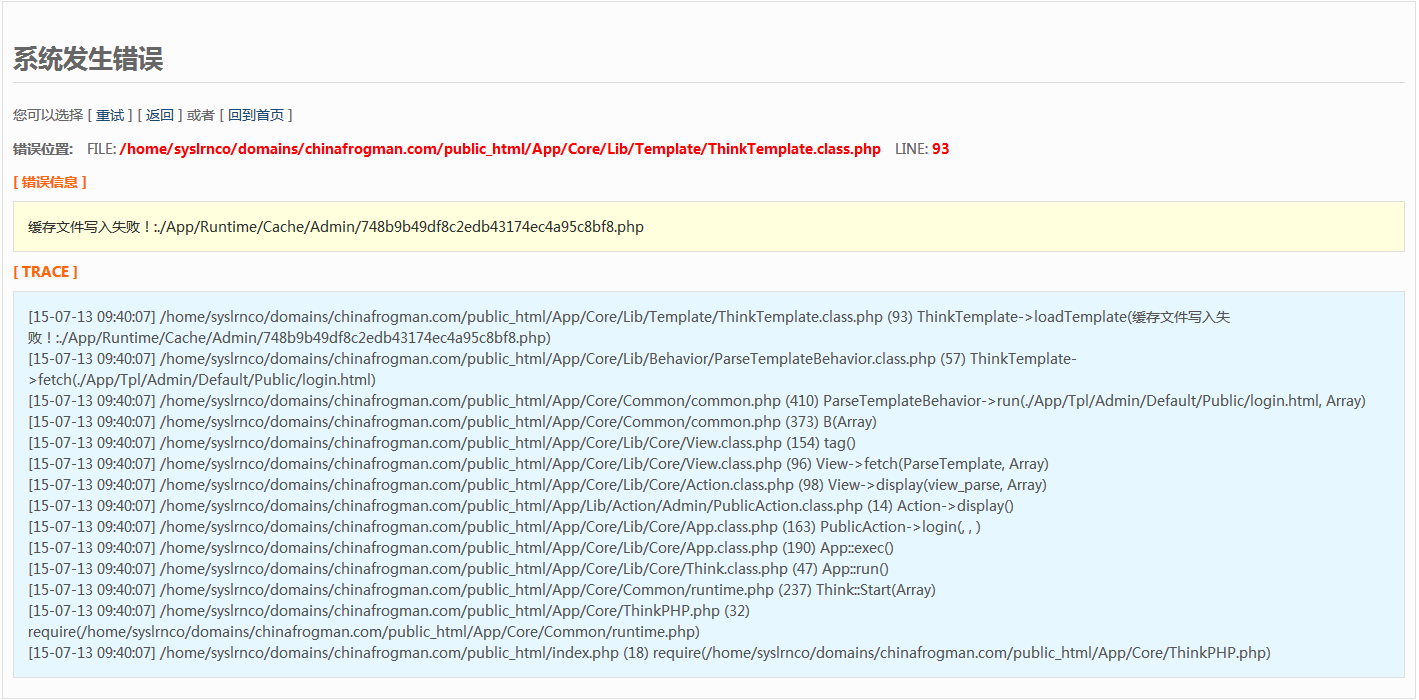 a.緩存文件沒有寫入權限 b.runtime文件不存在 c.空間磁盤已滿,無法寫入