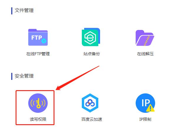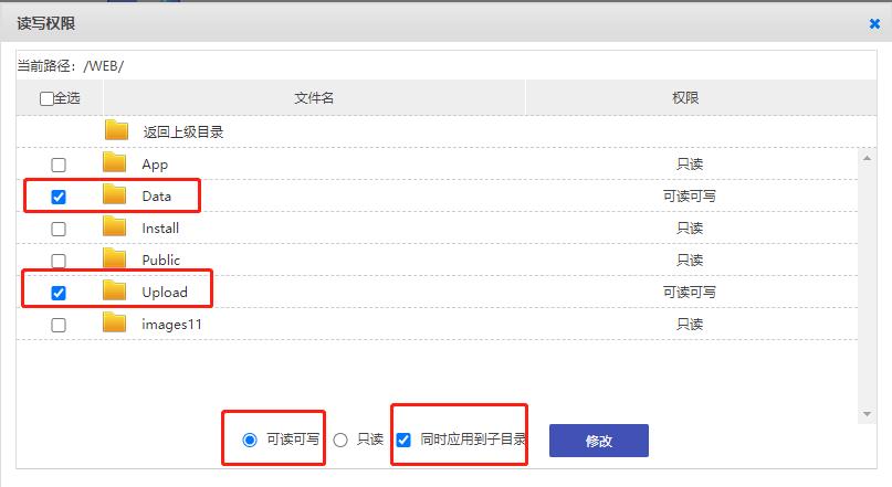 找到【讀寫權限】并打開,將網站根目錄設置為只讀,然后將Data和Upload目錄設置為可讀寫