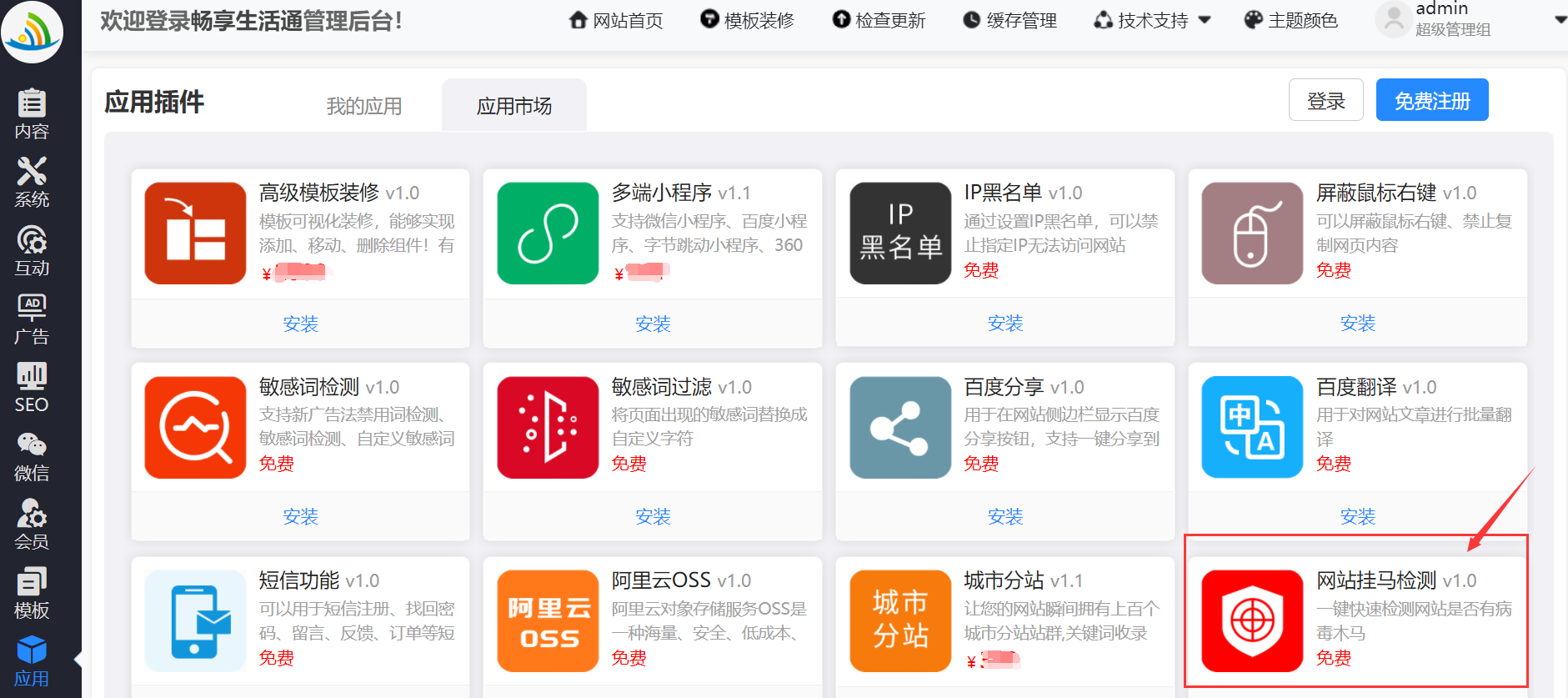 網站后臺——》應用——》我的應用——》找到“掛碼檢測插件”——》點擊安裝