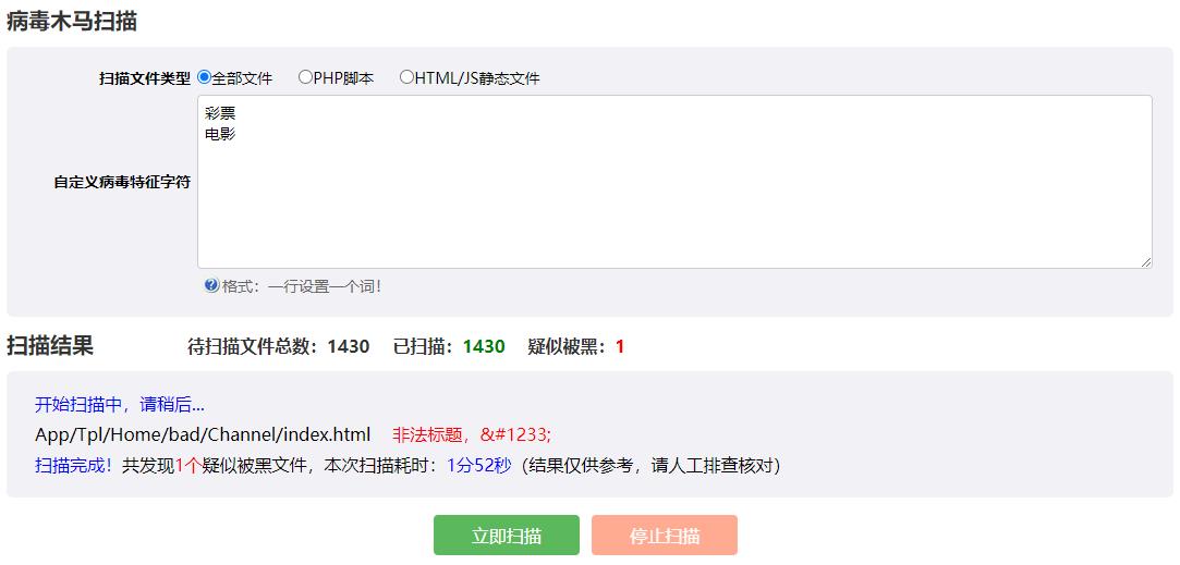 插件根據云端病毒特征碼+自定義病毒特征(選填)來檢測網站是否包含病毒木馬文件!