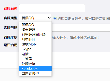 如下圖,輸入名稱,選擇類型,客服號(hào)碼,保存后前端則會(huì)顯示出對(duì)應(yīng)的圖標(biāo)和聯(lián)系方式。