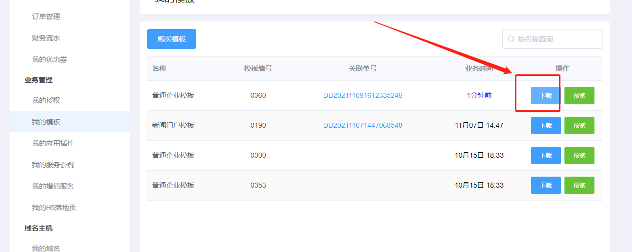 在線購買的模板,可以自行下載網(wǎng)站模板,位置:用戶中心——》我的模板——》下載。